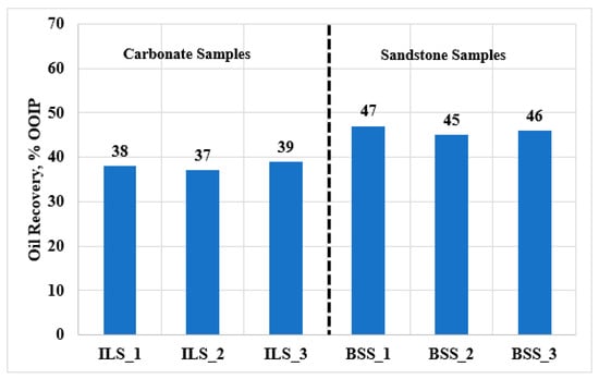 In this work, the oil recovery from carbonate and sandstone rocks was evaluated using coreflooding experiments. First, the performance of SW flooding to increase the oil recovery was studied by injecting SW bine of 57.3 g/L TDS into the carbonate and sandstone cores. Figure 2 shows the percentage of recovered oil using SW flooding from six core samples. It should be noted that all samples were prepared and treated using the same experimental conditions; hence, the changes in oil recovery can be attributed mainly to the rock types and the petrophysical properties. All the carbonate samples (ILS1–ILS3) showed oil recovery between 37% and 39% of the Original Oil in Place (OOIP), while flooding the sandstone samples (BSS1–BBS3) with SW showed higher oil recovery of around 45–47% of the OOIP. The petrophysical measurements showed that the sandstone samples had a higher rock permeability compared to the carbonate samples; hence, higher oil recovery was obtained for the sandstone samples. The average rock permeabilities were 10 and 75 mD for the carbonate and sandstone samples, respectively. Overall, SW flooding showed higher oil recovery from the sandstone samples compared to that from the carbonate samples, due to the high rock permeability of the sandstone samples.