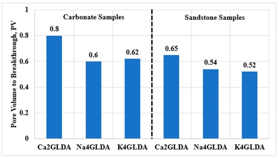 Pore volume to breakthrough during glutamic acid di-acetic acid (GLDA) flooding in carbonate and sandstone samples.