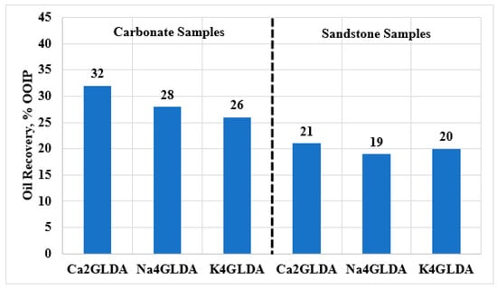 Also, the oil recovery during injection of GLDA solutions into carbonate and sandstone samples was determined, as shown in Figure 4. Higher oil recovery was achieved from the carbonate samples compared to from the sandstone samples, indicating that all types of GLDA solutions work better in a carbonate reservoir. The additional oil recovery varied between 26% and 32% for the carbonate samples, while around 19% to 21% of the OOIP was recovered from the sandstone samples. This could be attributed to the reaction behavior between GLDA solutions and the rock matrix. It is well known that carbonate rocks are more reactant compared to sandstone rocks. GLDA is a weak acid that can dissolve part of the carbonate matrix, similar to the HCl reaction with a slower reaction rate. Therefore, a higher chemical reaction rate will be induced in carbonate rocks compared to in sandstone, leading to higher oil recovery from carbonate formations. Furthermore, Ca2GLDA showed the highest oil recovery among all tested GLDA types, for both sandstone and carbonate samples. The maximum oil recovery of 32% was obtained by flooding carbonate samples with Ca2GLDA solutions. It should be noted that all coreflooding experiments were conducted at the same conditions and similar chemical concentrations and pH were used for all GLDA types. However, the chelating agent salt was changed during the coreflooding experiments. Hence, the additional oil recovery can be attributed mainly to the GLDA salt type; the best chelating agent type provides the highest oil recovery. Overall, the coreflooding experiments indicated that under the same conditions Ca2GLDA can outperform the other GLDA types and results in the highest oil recovery from carbonate rocks.
