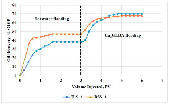 Oil recovery profiles from carbonate (ILS1) and sandstone (BSS1) rocks during SW and Ca2GLDA flooding.