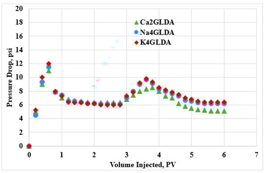 Pressure drop profiles during the injection of SW followed by Ca2GLDA, NA4GLDA, and K4GLDA.