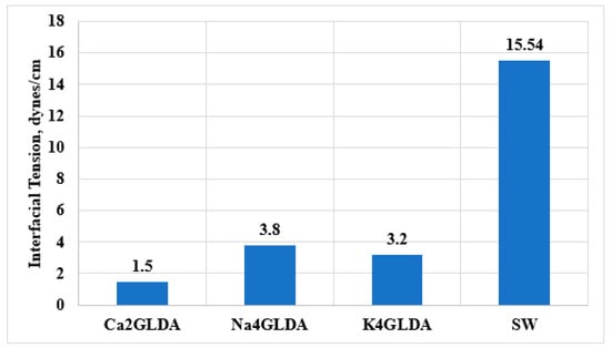 IFT at the oil/chemical contact is one of the crucial factors that affect oil recovery [,]. Reducing the IFT at the oil/brine interface can lead to improving the displacement efficiency, and hence, more oil can be produced. Introducing the chelating agent into the oil/brine interface can reduce the interfacial forces, leading to increasing the oil recovery [,]. In this work, the reduction in interfacial tension at the oil–brine interface due to the injection of chelating agents was examined. Figure 7 shows the IFT for oil/SW, oil/K4GLDA, oil/Na4GLDA, and oil/Ca2GLDA systems. The injection of GLDA solutions to the oil–brine system reduced the interfacial tension from 15.54 to less than 4 dynes/cm. Among all tested GLDA types, calcium-based solutions (Ca2GLDA) showed the lowest IFT value of 1.5 dynes/cm. Compared to the other GLDA types, Ca2GLDA can reduce the interfacial tension by around 57%, under the same conditions, revealing that more oil can be recovered by injecting Ca2GLDA solutions due to the reduction in capillary pressure. However, it should be noted that the IFT reduction by chelating agent may help for EOR, but the reduction in IFT and enhancement in capillary number are far from those obtained in surfactant-based EOR.
