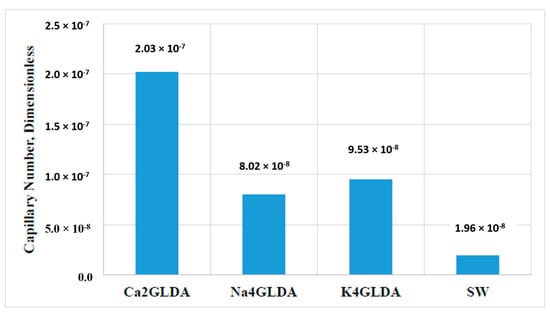 The impact of injecting chelating solutions on reducing the capillary pressure forces was estimated by calculating the capillary number before and after introducing the GLDA solutions. All parameters were kept unchanged except the interfacial tension. The interfacial tension experiments indicated that the IFT can be reduced by around 90% using GLDA chelating agent. The IFT reduction will result in raising the capillary number as described by Equation (1), thereby improving the hydrocarbon flow. Figure 8 shows the capillary numbers for the oil/SW, oil/K4GLDA, oil/Na4GLDA, and oil/Ca2GLDA systems. The injection of GLDA chelating agents can raise the capillary number (Nc) by a factor of 10.5 compared to the conventional SW flooding. As observed, Nc was increased from 1.96 × 10−8 to 2.03 − 10–7 by using GLDA injection. The increase in capillary number is mainly due to the reduction in IFT. The injected chelating agents created a small layer at the oil/GLDA contact, and this layer was generated due to the deprotonation of some acid components present in the crude oil. The generated layer led to inducing a surface-active zone in the form of soap, thus lowering the IFT in a way similar to surfactant flooding [,].