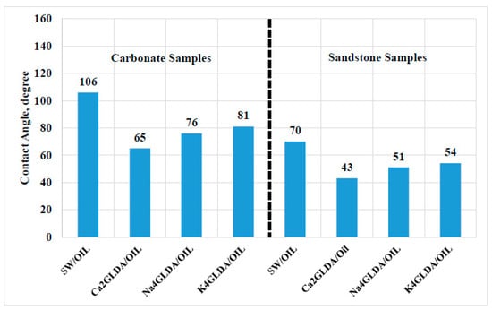 Rock wettability plays an important role during the oil recovery process. Altering the wettability condition to less oil-wet reservoirs can lead to increasing the oil production. In this work, the wettability conditions for the sandstone and carbonate samples were studied before and after adding chelating agents [,]. The results are provided in Figure 9. In general, higher values of contact angle (above 90°) indicate oil-wet conditions, and contact angles less than 90° indicate water-wet systems [,]. For carbonate samples, the contact angle was 106° during the SW flooding. Most of the carbonate reservoirs are oil-wet due to the adsorption of carboxylic hydrocarbon on the carbonate surface. However, introducing chelating agents to the carbonate/oil/SW system showed a significant reduction in the contact angle values, indicating that the carbonate wettability was changed from oil-wet to water-wet status. The lowest value for contact angles was obtained by using Ca2GLDA, revealing that the calcium-based GLDA outperforms other types of chelating agents in altering the rock wettability, thereby improving the oil recovery and utilizing the wettability alteration mechanism. On the other hand, all sandstone samples are water-wet as indicated by the contact angle values less than 90°. Then, adding the calcium-based GLDA to the brine oil system led to reducing the contact angle from 70° to 43°, i.e., more water-wet conditions. Overall, using Ca2GLDA can change the wettability conditions for the carbonate and sandstone samples to less oil-wet conditions, resulting in more oil recovery.