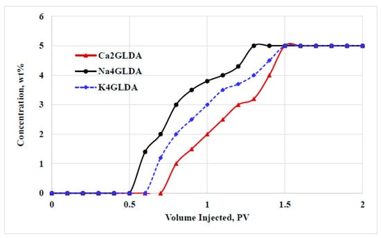 Enhanced Oil Recovery (EOR) techniques are applied to enhance hydrocarbon recovery utilizing several methods such as gas injection, thermal treatments, and chemical flooding [,]. EOR methods are implemented after the primary production, in which the natural reservoir energy is utilized to produce hydrocarbon. Various chemicals are injected into a reservoir to enhance the hydrocarbon flow by controlling the oil movement and minimizing interfacial tension (IFT) [,,,]. The most effective mechanisms during EOR treatments are wettability alteration, IFT reduction, and viscosity reduction. Common chemicals used for EOR treatments are surfactants, polymers or a combination of them [,,]. Recently, chelating agents have been introduced as new chemicals for improving the oil production from carbonate and sandstone formations by lowering the IFT or altering the rock wettability [,,,,]. Glutamic acid di-acetic acid (GLDA), hydroxyl-ethylethylene-diamine-tri-acetic acid (HEDTA), and ethylene-diamine-tetra acetic acid (EDTA) are used for EOR treatments [,,,,].