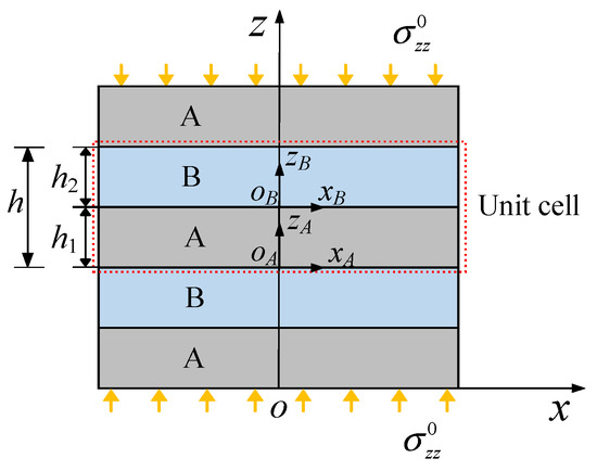 A traditional LPF consists of an infinite repetition of alternating concrete layer A with thickness h1 and rubber layer B with thickness h2 is schematically shown in Figure 1. The material parameters of concrete and rubber are listed in Table 1. The effect of the self-weight of the superstructure on the traditional LPF is reduced to uniformly distributed initial stress . A typical unit cell whose thickness is can be easily identified. Due to the spatial periodicity in the traditional LPF in Figure 1, it is sufficient to consider the dynamic characteristics of the only one typical unit cell to obtain wave propagation in the whole traditional LPF.