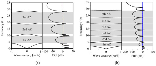 By using the computational methods in Section 2, the AZs and FRFs of traditional LPFs with Ι–type and ΙΙ–type unit cells with can be obtained, as shown in Figure 4, where the thicknesses of unit cells are taken as a = 0.5 m and b = 1 m. It can be easily found from Figure 4 that the frequency ranges where the values of FRF are negative match well with the corresponding AZs. Moreover, by comparing the AZs in Figure 4a,b, it can be seen that the AZs of the traditional LPF with thicker unit cells are lower and narrower, which demonstrates that it is difficult to achieve both comparatively low and wide AZs of traditional LPFs with identical unit cells by tuning the thickness of unit cells.