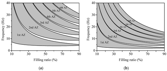 Figure 5 shows the AZs of the traditional LPFs with Ι–type and ΙΙ–type unit cells changing with the filling ratio of rubber material, which is confined from 10 to 90%. It can be found from Figure 5 that the AZs of traditional LPFs with Ι–type and ΙΙ–type unit cells are getting narrower and the gaps between adjacent AZs wider as the filling ratio of rubber material increases to 90%. This is because that the dynamic property of traditional LPF is approaching that of homogeneous rubber material when the filling ratio of rubber material is sufficiently large and approaching 100%. It should be noted that similar cases can also be found as the filling ratio of rubber material approaches 0.