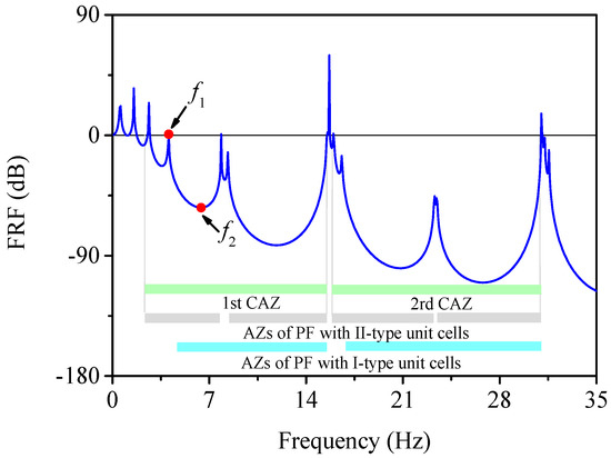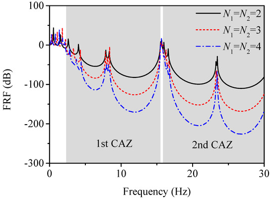 Figure 9 shows the FRFs of the CLPF with various numbers of Ι–type and ΙΙ–type unit cells. It can be seen from Figure 9 that the excitation attenuation in the CAZs is larger as the numbers of Ι–type and ΙΙ–type unit cells in the CLPF increases, which is in accordance with the results in the previous studies of traditional LPFs [18].