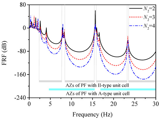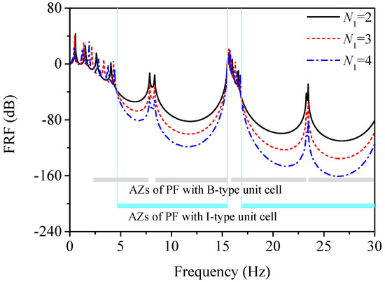 Figure 10 shows the FRFs of the CLPF with two Ι–type unit cells and various numbers of ΙΙ–type unit cells. It can be seen from Figure 10 that only excitations in the AZs of the traditional LPFs with ΙΙ–type unit cells are attenuated more drastically as the numbers of ΙΙ–type unit cells in the CLPF increases, while those outside AZs of the traditional LPFs with ΙΙ–type unit cells are almost not affected. Figure 11 shows the FRFs of the CLPF with various numbers of Ι–type unit cells and two ΙΙ–type unit cells. Similarly to the phenomenon in Figure 10, it can be seen from Figure 11 that only excitations in the AZs of the traditional LPFs with Ι–type unit cells are more drastically attenuated as the numbers of Ι–type unit cells in the CLPF increases, while those outside the AZs of the traditional LPFs with Ι–type unit cells are almost not affected, which implies that the generation of CAZs of CLPFs results from both the contribution of the AZs of both the traditional LPFs with Ι–type and ΙΙ–type unit cells.