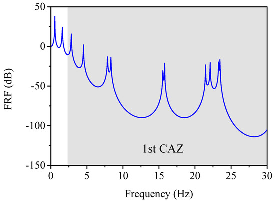 In this section, a CLPF with N1 = N2 = 2 and optimized geometric parameters is designed and its seismic performance is investigated. The geometric parameters of Ι–type unit cell are a = 0.5 m and fr = 22%, and those of the ΙΙ–type unit cell are b = 1 m and fr = 30%. Hence, the thickness of the designed CLPF is 3.39 m. Figure 12 shows the FRF of the CLPF with optimized geometric parameters, where the first CAZ can be identified from 2.33 to 30 Hz. Compared with previous studies on traditional LPFs [6,17], the CAZ of this CLPF is featured with both a lower starting frequency and larger bandwidth.