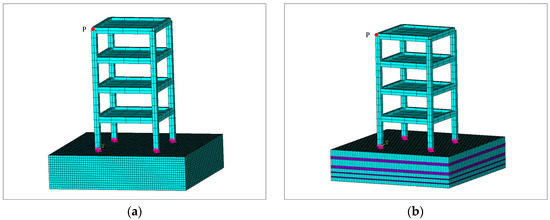 For comparison purposes, a pure concrete foundation with the same thickness as the designed CLPF is also considered, as shown in Figure 13a. The finite element model of the CLPF with a four-story concrete structure is shown Figure 13b. The plane dimensions of the concrete foundation and CLPF is 14 m × 14 m. The size of the upper structure is 6 m × 6 m × 12 m. The cross-section of the beams and columns are 0.4 m × 0.6 m and 0.5 m × 0.5 m, respectively. The thickness of the floors is 0.1 m.