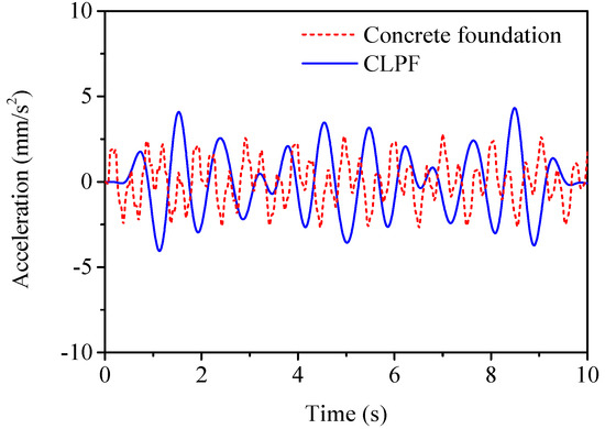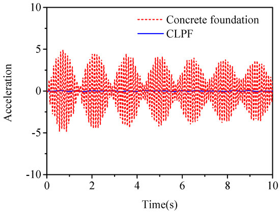 Figure 14 shows the acceleration responses of the node P under harmonic excitation with frequency f = 2 Hz, which is outside the first CAZ of the CLPF. It can be found from Figure 14 that the acceleration response of node P with the CLPF is slightly larger than that with the concrete foundation. Figure 15 shows the acceleration responses of node P under harmonic excitation with frequency f = 10 Hz, which is in the first CAZ of the CLPF. It can clearly be seen from Figure 15 that the acceleration response of node P with the CLPF decreases compared with that with the concrete foundation, which verifies the theoretical results of CAZs in Section 3.2.