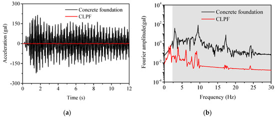 Figure 16 shows the acceleration record of the Whittier Narrows–02 seismic wave and its Fourier spectra. It can be seen from Figure 16 that the dominant frequencies of the Whittier Narrows–02 seismic wave are from 3 to 8 Hz, which are covered by the first CAZ of the CLPF (2.33 to 30 Hz). Figure 17 shows the acceleration of node P under the Whittier Narrows–02 seismic wave and its Fourier spectra, where the shaded area is the first CAZ of the CLPF. It can be found from Figure 17 that the acceleration of node P with the CLPF is effectively reduced compared with that with the concrete foundation, which results in the reduction in the corresponding acceleration components in the first CAZ.