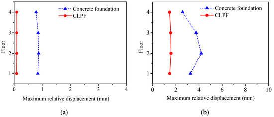 Maximum relative displacement of superstructure under: (a) the Whittier Narrows–02; and (b) the Oroville–01 seismic waves.