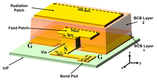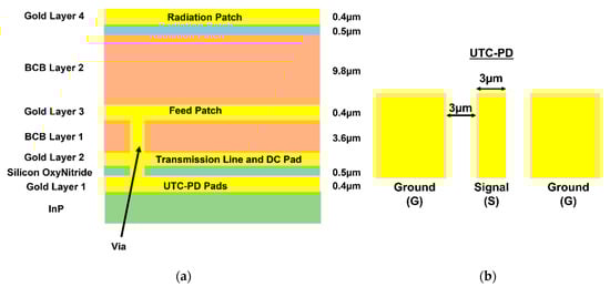 The UTC-PD has a ground-signal-ground (GSG) output. Therefore, the signal pad is connected to the top feed patch employing a via etched in the epitaxially grown BCB Layer 1 (see Figure 1a) on top of a large gold ground plane deposited using Gold Layer 1. The BCB is a low-k dielectric compatible with InP processes which has a relative dielectric constant (ε) of 2.3 @ 300 GHz with a loss tangent (δ) of 0.01. It provides the ability to realise antenna elements over an InP substrate. The ground plane shields the mm-wave signal from back-radiating through a high dielectric constant InP substrate underneath. The epitaxial layer stack-up is shown in Figure 1a. A single 4 µm thick via is etched through the BCB Layer 1 with the same dimensions as the signal pad (Figure 1b).