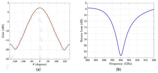 The unit cell was simulated using Ansys HFSS v17. The simulated gain along (angle relative to the z axis) and return loss assuming a port impedance of 15 − j8 Ω are presented in Figure 3. The unit cell can provide a gain of 2.5 dBi with a matched impedance bandwidth of 10 GHz.