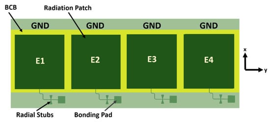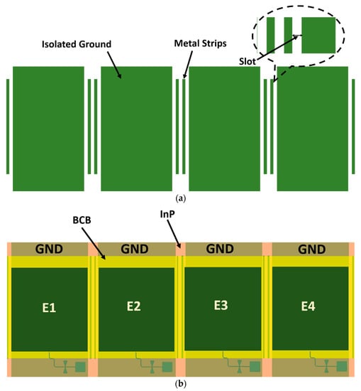 This configuration is challenging for PCB technologies, but in the case of the presented array structure, such a combination of dielectric materials already exists. From the layer stack-up of Figure 1, it can be observed that by removing Gold Layer 1, the two dielectrics BCB and InP can provide the necessary sandwiched dielectric material. InP has a higher relative dielectric constant (ε =12), thus providing the possibility to realise a slot length (Ls) less than or equal to the length of the radiating patch. The effective relative dielectric constant of both materials is approximately 9. Using a combination of parasitic metal strips with an isolated ground plane (MSWIGP), the ground plane is modified to mitigate the mutual coupling, thereby creating a defected ground plane. The modified layout of the array structure is shown in Figure 8a. The isolation is provided by the slots placed between the ground planes and the parasitic metal strips. The width of the metal strip is 9 µm (which is obtained parametrically), and of equal length to that of the BCB layer on top, i.e., The slot is created by parametrically varying the distance between metal strips and the ground plane. The slot is 26 µm wide with a length of 600 µm. The distance between two ground planes of adjacent radiating elements (including strips and slots) is 70 µm. This modified ground plane or MSWIGP is used to create the 1 × 4 array. The layer structure and dimensions of elements are kept constant.