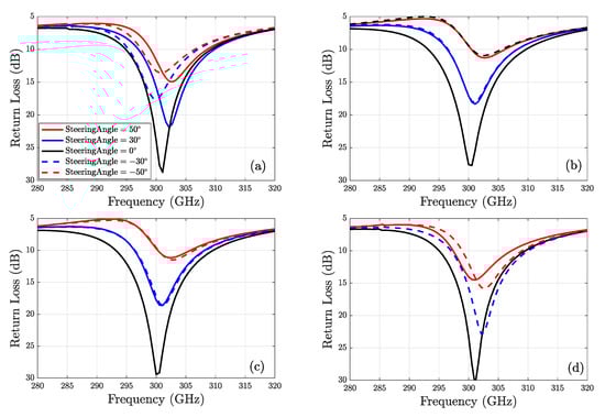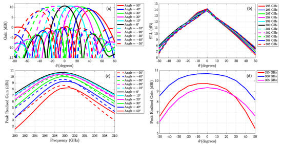 By using the unit cell, a linear, uniformly spaced 1 × 4 array was also designed. The total area of the array is 2 × 0.6 mm2. The top view of the designed array is shown in Figure 4. Such an array can provide a gain of 10.85 dBi with a steering angle scanning range of 100°. The proximity of the radiating elements alters the boundary conditions of the unit-cell. This effect can be observed by plotting the active reflection coefficient for each unit-cell for different steering angles. For a steering angle of 0°, or when no phase shift is applied between elements, it can be observed that all the four radiating elements present an identical reflection coefficient across the whole bandwidth (Figure 5). As the phase shift between the driving signals of each element increases, the impedance matching bandwidth deteriorates. For extreme angles, i.e., ±50°, the array provides a bandwidth of merely 4–5 GHz, and the central elements are not matched at frequencies below 300 GHz. In Figure 6a,b, the beam steering pattern and sidelobe levels (SLL) are plotted as a function of frequency and steering angle. The SLLs shown in Figure 6b are asymmetric for varying steering angles. A signal with a wide bandwidth will be subjected to non-uniform gain and grating lobes at different frequencies, which can result in channel degradation and signal transmission loss. The peak realised gain (where realised gain is the gain of an antenna reduced by the losses due to mismatch of the antenna input impedance to a specified impedance []) shown in Figure 6c,d is not symmetric for positive and negative steering angles, indicating that the gain performance will not be uniform across the entire scanning range. The gain of the array will be significantly impacted for higher frequencies.