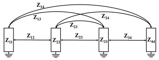 The problem of mutual coupling is complex due to the dependence of the array’s parameters on the phase of the driving signal. A circuit model of mutual impedance is presented in Figure 7. The impedance Zij (where i ≠ j) has two components, i.e., static and dynamic. The static part of Zij is caused by a shared ground plane and the propagation of substrate waves. The array structure loosely resembles a slab waveguide with metal plates on the top and bottom. The width and height of such a structure can support mode propagation, which causes a mutual coupling between elements. The dynamic part of Zij is caused by near-field interaction between radiating elements. The radiation patches form a capacitor, with the initial condition being determined by the driving signal. For example, if Element #1 is excited, the other elements will accumulate a specific amount of charge due to capacitive coupling. When Element #2 is excited, it already has some charge accumulation which acts as a capacitive load with non-zero initial condition. For time-varying signals, the problem of determining the initial condition of a coupler capacitor is more complex.