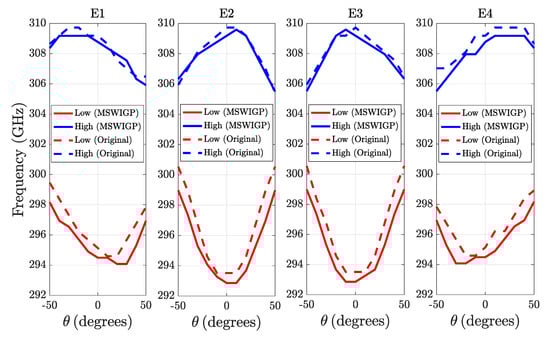 The modified array was simulated, and the active reflection coefficient was obtained for each radiating element. Figure 9 presents a comparison of the bandwidth improvement in terms of the reflection coefficient. This comparison is obtained by plotting the frequency crossing point for a reflection coefficient of −10 dB as a function of the steering angle. Figure 9 illustrates the frequencies for which the reflection coefficient of the radiating elements is below −10 dB while the steering angle is varied from −50° to 50°. It can be observed that MSWIGP improves the bandwidth of all antenna elements, especially the central elements (elements 2 and 3). For extreme steering angles, the reflection coefficient is now less than −10 dB for frequencies below 300 GHz, a clear improvement. There exists some degradation for higher frequencies (>305 GHz), but the unit-radiating element is not designed for these frequencies. The centre frequency can be tuned by optimising the structure of the unit radiating element.