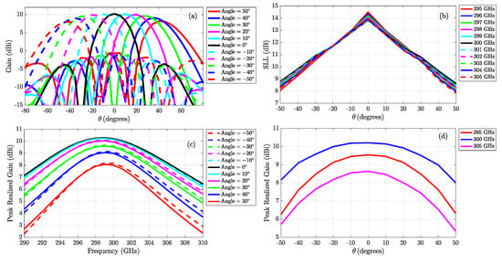 (a) Steering pattern for 1 × 4 array at 300 GHz, (b) SLL of array, (c) peak realised gain vs. frequency for varying steering angles, (d) peak realised gain vs. steering angle for different frequencies.