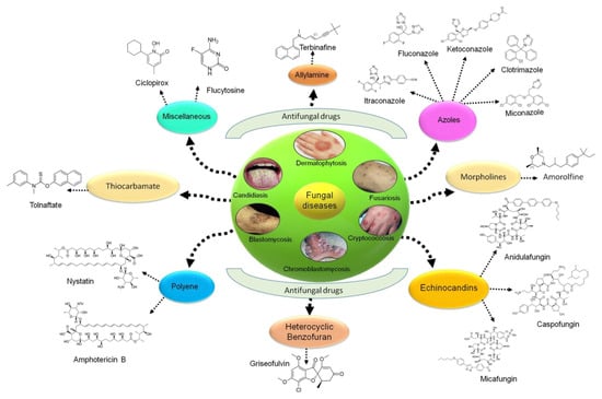The treatment of fungal diseases involves systemic and topical antifungal agents, depending on the type of fungal skin disease, infection area, and skin penetration. Topical treatment is the most common for all kinds of skin infections. The classes of antifungals approved for treating patients with invasive fungal infections (IFIs) are triazoles, polyenes, and echinocandins [18].
