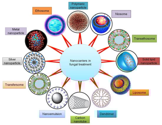 Nanocarriers possess unique optical, electrical, mechanical, or chemical characteristic features, which show advantages over the conventional dosage form [24]. Nanotechnology is involved in the creation of devices and materials [24,25]. A wide variety of nanocarriers used as drug delivery systems (DDS) for the treatment of fungal diseases include phospholipid vesicles (such as liposomes, transfersomes, ethosomes, transethosomes, etc.); non-phospholipid vesicles (spanlastics and niosomes); nanostructured lipid carriers (NLCs); solid lipid nanoparticles (SLNs); nanoemulsions; polymeric nanoparticles (such as chitosan-based nanoparticles); metal oxide nanoparticles; silver nanoparticles (AgNPs); carbon nanotubes (CNTs); and dendrimers (Figure 2).