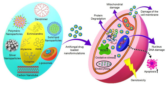 While the number of NPs types and applications continues to increase, studies to characterize their effects after exposure and to address their potential toxicity are few in comparison. Compared to conventional substances in a microscale, NPs (diameter < 100 nm) stand on a huge reactive surface able to interact with biological systems and cause toxic effects. Most of the antifungal drugs have poor water solubility, which tends to show a lower absorption and bioavailability. It can be improved by forming complexes using nanocarriers. By virtue of their nano sizes, they have greater interactions with biological surfaces, with pro and con effects [102]. Schematic mechanisms of cytotoxic activity of antifungal drug-loaded nanocarriers are represented in Figure 3.