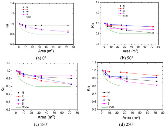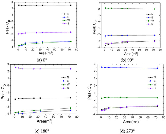 3.2.1. Extreme Pressure Coefficient for Different Area Sizes under Different Wind Angles