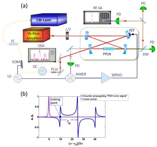 The experimental scheme we used is sketched in Figure 1a. A 15 mm long periodically poled MgO:LiNbO crystal, with a poling period of m, was placed in a traveling wave bow-tie cavity that was resonant for the pump and with a free spectral range (FSR) of 501 MHz. The cavity had a mirror mounted on a piezoelectric actuator for cavity length control and the crystal temperature was actively stabilized by a Peltier element for phase-matching control. The pump source is a narrow linewidth (40 kHz over 1 ms) cw Yb-doped fiber laser, emitting at 1064 nm. A laser power of a few mW seeded a Yb-doped fiber amplifier that amplifies it up to 6 W and pumped the second-harmonic generation (SHG) cavity. We obtained high-power buildup by implementing the cavity using a -reflectivity plane coupling mirror, a curved mirror with reflectivity , while the remaining mirrors were high-reflection coated (R ). The measured cavity resonance full width at half maximum is 1.2 MHz (finesse, 400; Q-factor, ∼) when the pump power is 10 mW (cold cavity). In these conditions, we observed internally pumped OPO as in [11], but we measured a lower threshold of 20 mW input pump power. We thermally stabilized the dedicated cavity breadboard by active control to enable robust long-term operation.
