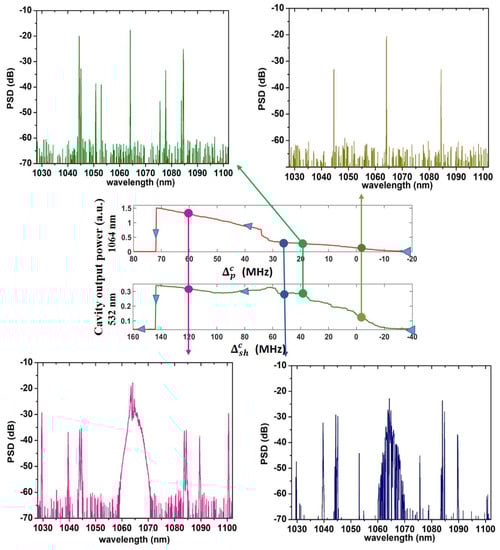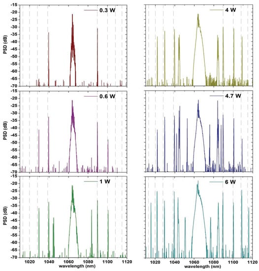 Hereafter, we focus our investigations on the maximum achievable wavelength broadening for high values, i.e., in the region where the pump laser is less blue detuned (Figure 4). We report spectral broadening for pump powers up to 6 W. For 0.3 W, 0.6 W, and 1 W, the acquired spectra correspond to values of 9, 15, and 30 MHz, respectively. For larger powers, we used a thermally induced self-locking of the optical cavity [40], and the values are, therefore, not measured exactly. Increasing the input power, the parametric sidebands arising far from the pump evolve into “clustered” optical frequency combs, and at the maximum power available, they extend over a wavelength range spanning up to 100 nm.