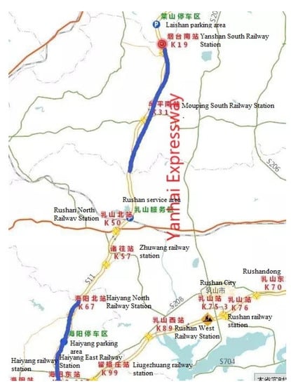 The research data were derived from vehicle operating data and drivers’ facial videos of 50 freight vehicles provided by the vehicle cloud control platform of a logistics company for nearly one month. The driving path is an expressway in Shandong Province. Take the Yanhai Expressway as an example, the driving path is shown in the Figure 1. Through the evaluation of the drivers’ fatigue degree and the extraction of significant parameters of vehicle operating data, a total of 396 samples data were obtained, of which the number of samples for each fatigue degree was 132. Each data sample contains nine operating parameters of vehicles that are significantly affected by the fatigue degrees and one driver fatigue degree.