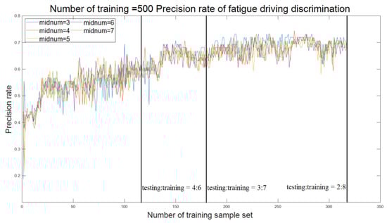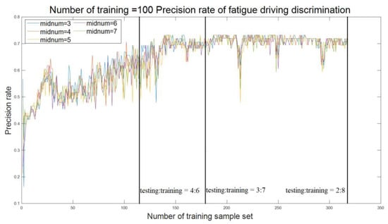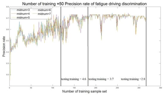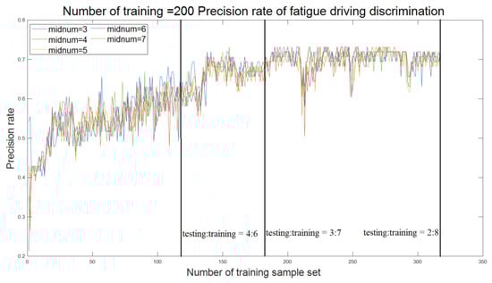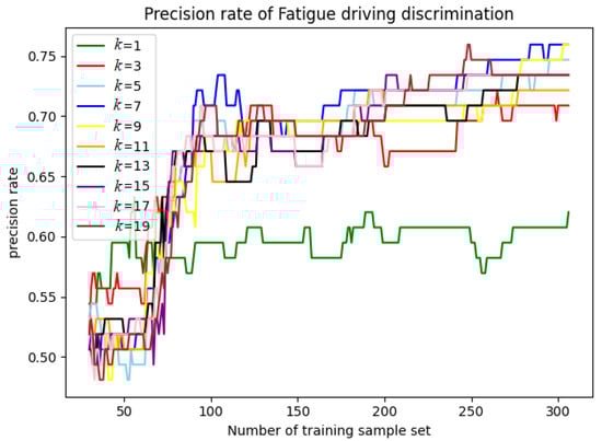 Figure 2 and Table 4 show that when values (smaller values) are 1 and 3, the detection accuracy fluctuates greatly with the change of the number of training samples, and the accuracy is relatively low. When values (larger values) are 5, 7, 9, 11, 13, 15, 17, and 19, and the number of the training samples isgreater than 70, the detection accuracy improves as the number of training samples increase and, until the number of training sample is greater than 200, the accuracy reaches more than 70.0% with a stable trend. When the value is 7 with the number range of training samples of 284–306, the accuracy of fatigue driving detection reaches the maximum value of 75.9%. Therefore, the value of the model should be set to 7, and when the ratio of the test set to the training set is between (2:7)–(2:8), the accuracy is high with strong stability so that requirements for training samples are low.