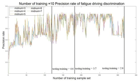 Under the premise of setting the training times as 10, 50, 100, 200 and 500, respectively, the different numbers of hidden layer nodes are taken to obtain the accuracy of fatigue driving detection with the different ratios of training sample and test sample (see Figure 4, Figure 5, Figure 6, Figure 7 and Figure 8). No matter what the value of the training time is, when the detection accuracy reaches the maximum, the number of hidden layer nodes is 7. Therefore, the number of hidden layer nodes is determined to be 7. In addition, the model requires higher training data. Although the ratios of the test sample to the training sample are at 4:6, 3:7, and 2:8, the detection accuracy is above 70%, yet among these ratios, the detection accuracy fluctuates greatly.