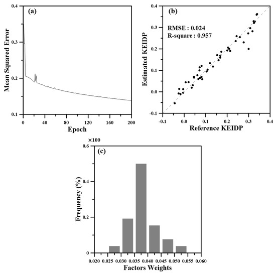 The MLP-ANN approach that learns the relationship between input data and reference data with multiple nodes and layers can be used to learn or predict AHP results [44,45]. In this study, the KEIDP calculated from the AHP method was learned by producing the MLP-ANN model using EIA Big Data as input data (Figure 2 and Table 2). There were few development projects with KEIDP and EIA Big Data, but the trained data can explain the whole development project with a margin of error of about 7% at a 95% confidence level [46]. After completing the learning, it was confirmed that the MLP-ANN model to calculate the KEIDP using EIA Big Data was effective. Comparing the estimated KEIDP and the true KEIDP, the correlation coefficient was 0.957 and the RMSE was 0.024 (Figure 3b).