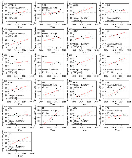 Figure 4 shows the trend in the proportion of environmentally friendly projects according to each indicator. Here, environmentally friendly means that the normalized index result calculated from Equation (2) presented a positive value. These projects reduced the value of indicators affecting the environment after their completion, and it could be assumed that the project outcomes reflect the EIA results. The proportion of projects with reduced PM10, nitrogen dioxide, sulfur dioxide, ozone, hydrogen ion concentration, suspended solids, total nitrogen, total phosphorus, total coliforms, cadmium, copper, arsenic, lead, zinc, and fluorine indexes increased by more than 2% per year. The proportion of projects with reduced carbon monoxide, dissolved oxygen, chemical oxygen demand, biochemical oxygen demand, mercury, and nickel indexes increased by less than 2% per year. Overall, the percentage of environmentally friendly projects according to each indicator steadily increased compared to the past. It was found that the percentage of environmentally friendly projects did not exceed 50% in 2007, but exceeded 50% by the end of the study period.