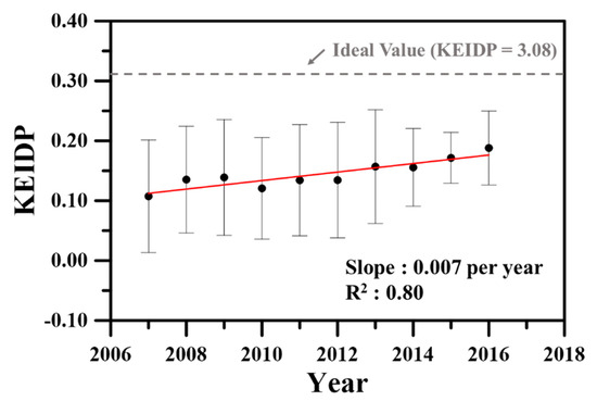 Figure 5 shows the mean KEIDP trend calculated using the MLP-ANN model with EIA Big Data for all 611 projects. The error bars shown in Figure 5 represent one standard deviation of the mean value for the projects carried out each year. Because the input data of the MLP-ANN model were normalized indicators, an increase in the proportion of projects with positive values was reflected. The mean value of KEIDP gradually increased. The rate of increase was 0.007 per year, with an value of 0.8. This means that the number of environmentally friendly projects (which worked to minimize their environmental impact) gradually increased during the study period. Although there is still a difference from the ideal KEIDP, it has increased from about 0.1 in 2007 to about 0.18 in 2016.