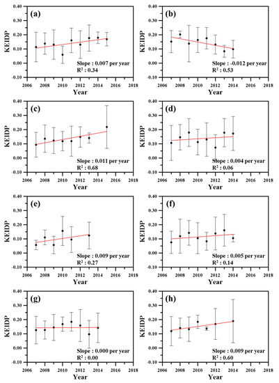Figure 6 shows a graph of the overall KEIDP trends by organization. The organizations that were analyzed were the Ministry of Environment, Daegu Province Environmental Agency, Han River Basin Environmental Agency, Geumgang Basin Environmental Agency, Jeonbuk Province Environmental Agency, Nakdong River Basin Environmental Agency, Wonju Province Environmental Agency, and Yeongsan River Basin Environmental Agency. Because these organizations performed an EIA and measured environmental data, it was possible to confirm which institution’s EIAs most strongly considered the environmental impact of the development project. As a result of the analysis, the KEIDP trends managed by the Ministry of Environment, Han River Basin Environmental Agency, Jeonbuk Province Environmental Agency, and Yeongsan River Basin Environmental Agency were found to increase by more than 0.007 per year. However, the KEIDP trends managed by the other agencies were found to change only slightly or not at all. There was even a decrease in the KEIDP for projects managed by the Daegu Province Environmental Agency.