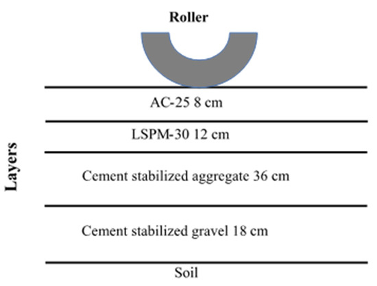 Table 1 shows the pavement structure in the project, including the subgrade, one subbase layer, two semi-rigid base layers, one flexible base layer, and three hot-mix asphalt (HMA) surface layers. The compaction test was performed at the AC-25 layer with a thickness of 8 cm, as is shown in