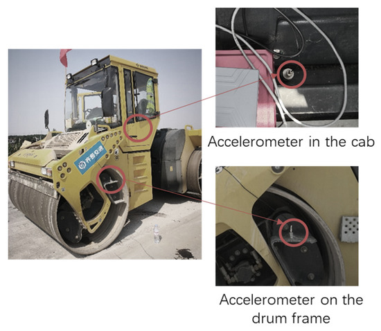 Two accelerometers were used to collect the vertical vibration acceleration signals: one was carefully mounted on the drum frame and another one was mounted on the floor of the cab, as shown in