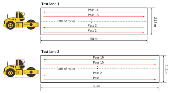 Figure 2. The compaction was performed on two test lanes. The lengths of “test lane 1” and “test lane 2” were 50 m and 60 m, respectively. The width of the test lane was 2.13 m. The roller pass trajectory on each test lane is shown in