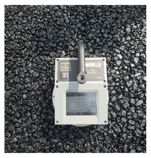 Figure 4. PQI380 uses impedance spectroscopy to measure the electrical response of asphalt from which the density is calculated. The density determined by the PQI380 is highly material-dependent, so it is required that the mix information for each mix design is input accurately into the gauge. The mix information includes stone sizes, depth, and maximum theoretical density (MTD). For one pass, the degree of compaction was measured about every 10 m and the mean value is used to indicate the degree of compaction of this pass.