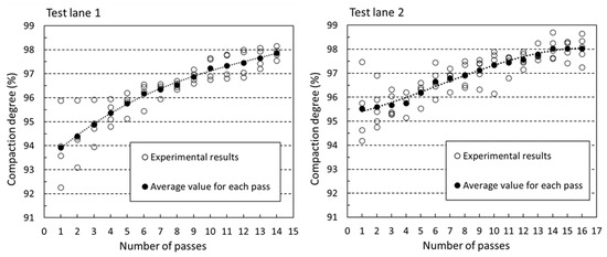 Figure 5 shows the measuring results of the degree of compaction. The open circles denote the degree of compaction measured in the in-situ tests, the solid circles denote the average degree of compaction for each pass. It can be seen from