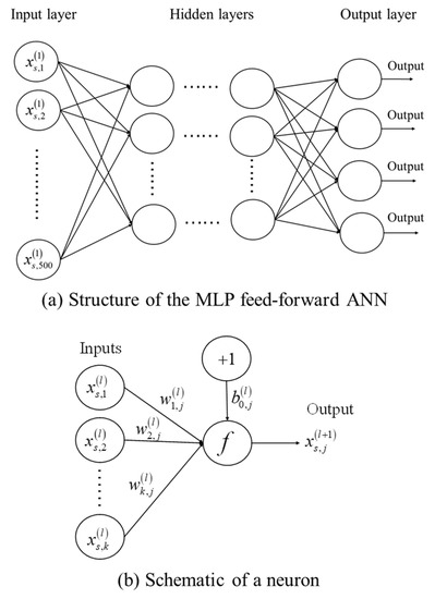 In Equation (2), the subscript s denotes the sth sample, the number of nodes is k in the lth layer. denotes the ith input of the lth layer. denotes the jth output of the lth layer, meanwhile, also denotes the jth input of the (l + 1)th layer. denotes the weight from the ith input to the jth output. denotes the weight from the bias term of the lth layer to the jth output. f() denotes the activation function. In this study, all the bias terms were set as 1. A softmax function, , was adopted for the output layer, and a sigmoid function, , was used in the rest of the layers.