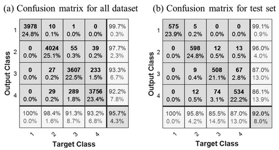 Figure 9. Each column of the matrix denotes the samples in an actual class while each row denotes the samples in a predicted class. The cells on the diagonal line denote the correctly classified samples. The off-diagonal cells denote the incorrectly classified samples. In each cell, the upper number denotes the number of samples and the lower number denotes the percentage of the total number of samples. The far-right column shows the accuracy of classification in each predicted class. The bottom row shows the accuracy of classification in each actual class. The cell in the bottom right shows the overall accuracy.