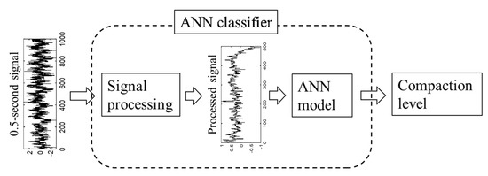 Figure 10, an ANN classifier can be gotten by integrating the signal processing procedure and the ANN model. Once inputting a 0.5-s signal, the ANN classifier will output an estimated compaction level. Network 3 was used as the ANN model in the ANN classifier since Network 3 had the best training performance.