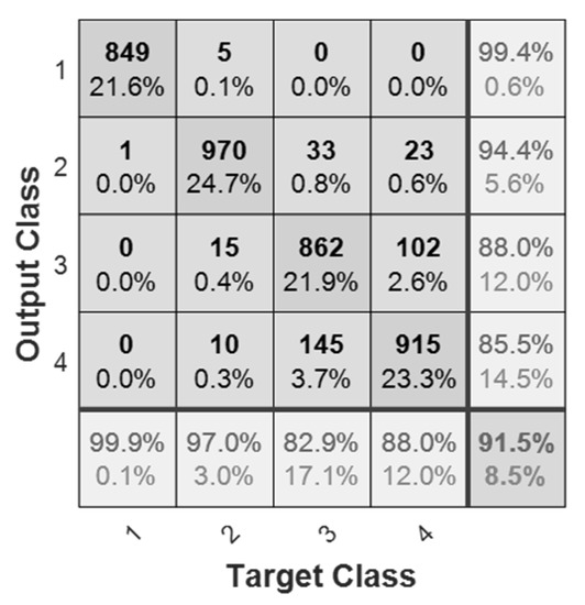 Figure 11 in the form of a confusion matrix. The overall accuracy was 91.5%, and the ANN classifier had the worst performance on the recognition for the signals of level 3 with an accuracy of 82.9%.