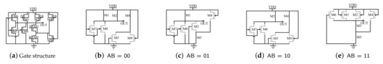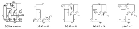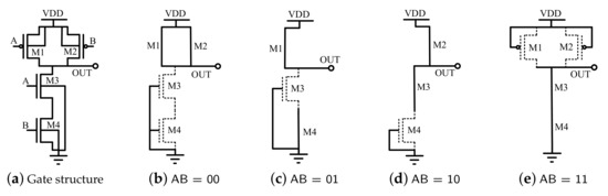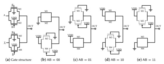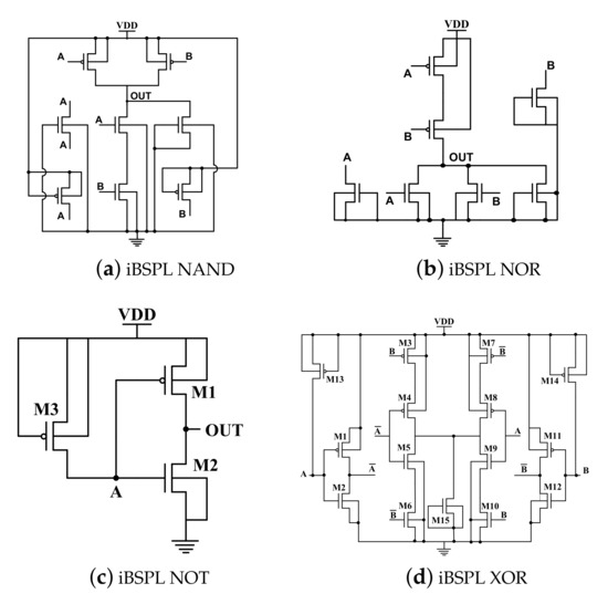 The design procedure for the NOR gate is almost the same as for the NAND gate, except that and are compared in step 1, and in step 2, and and in step 3. Similar procedures can be applied to balance the currents leaked by NOT and XOR gates. The resulting cells are shown exemplarily for our 40 nm technology in Figure 8a–d. It is clear that when applying this approach to different process technologies, the number of transistors required for the balancing as well as their size and type, are not necessarily constant. Thus, the concrete overhead associated with iBSPL depends on the underlying process technology. We have listed the required transistor numbers, types and widths for both of our technology generations and all four different logic gates in Table 3.