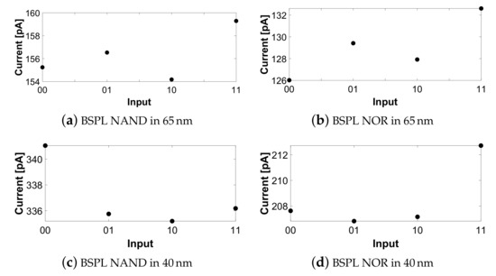 Despite the general design issues pointed out above we want to analyze how effectively BSPL gates balance the leakage currents in smaller geometries, compared to the initially analyzed 180 nm library in [27]. Therefore, we have simulated the leakage currents of BSPL NAND and NOR gates exemplarily in our 65 nm and 40 nm technologies. The results can be seen in Figure 5.